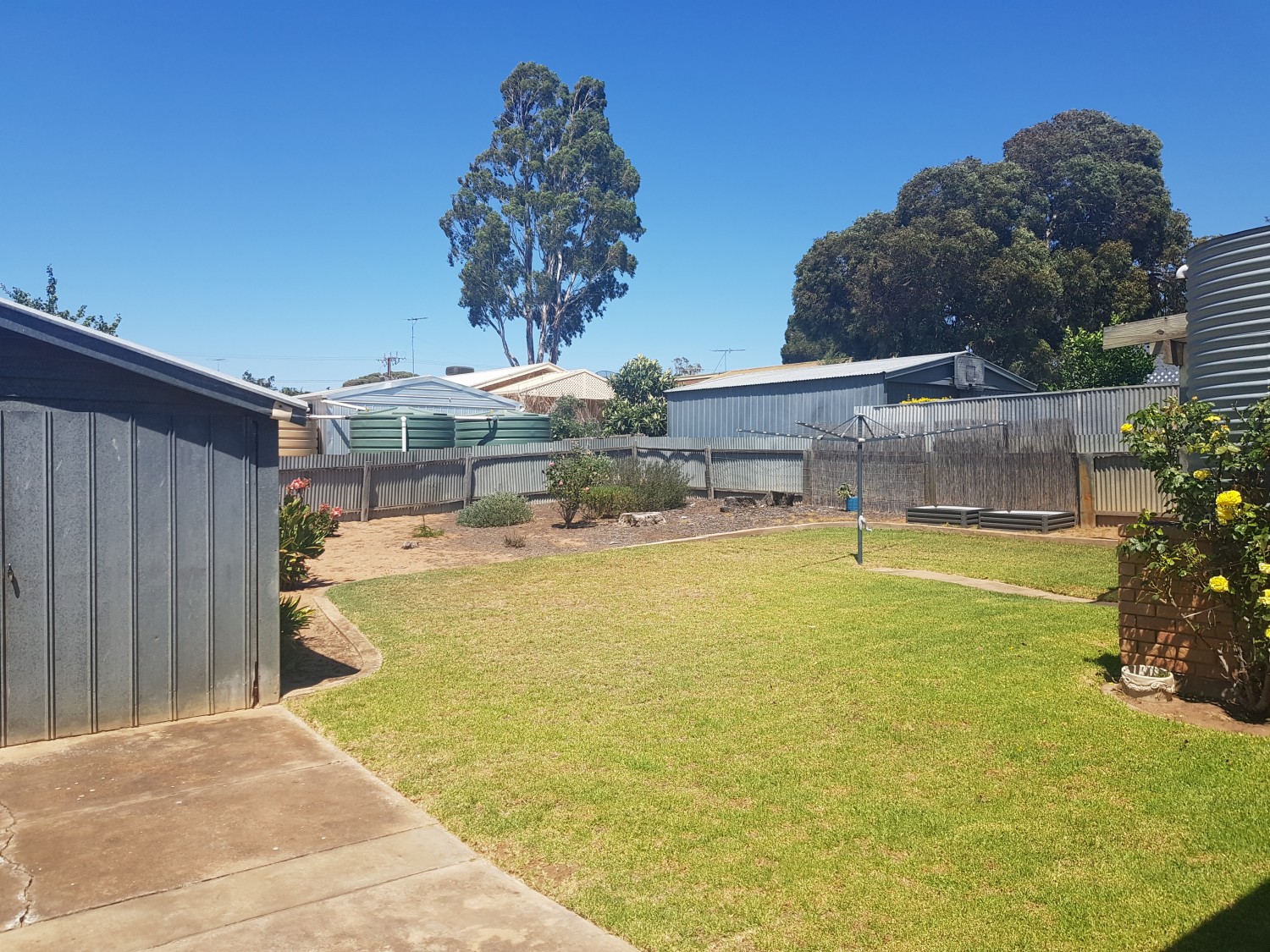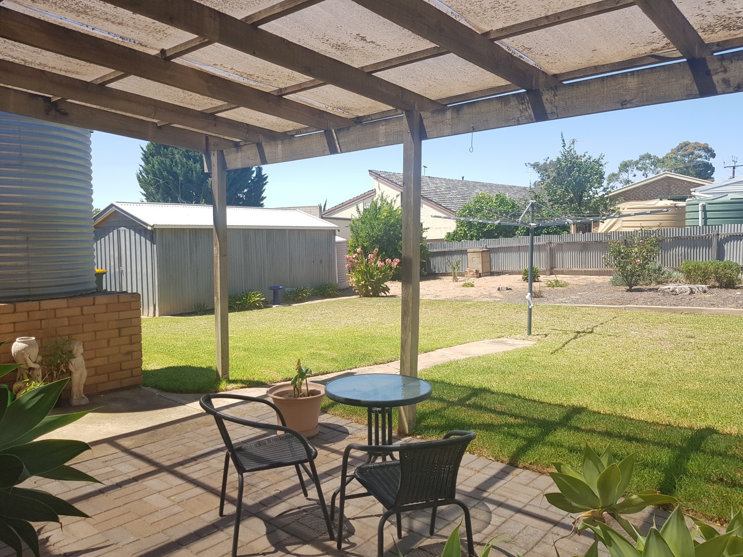 Outside is a lovely shade pergola, a fully fenced lawned yard, rainwater storage, galvanised iron garage and single carport with roller door.