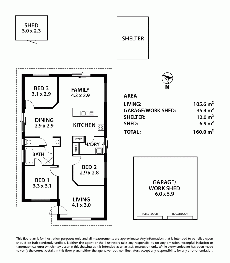 A gable roofed alfresco entertaining pavilion ideal for the weekend BBQ, a detached double garage with twin roller doors and a neat garden shed purposefully planned within easy care and well-established gardens
