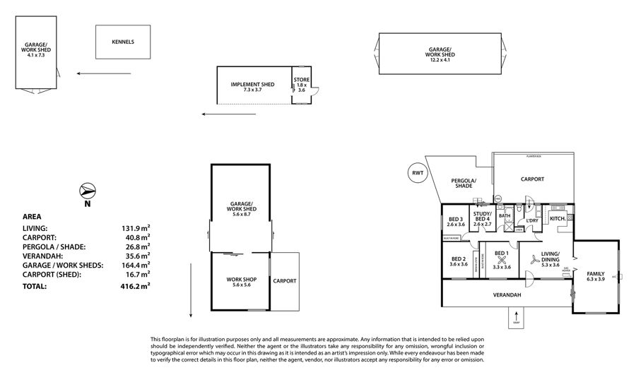 Full of promise... Primed for fresh energy & inspiration. An exceptional opportunity for a rewarding repair / refurbishment - this spacious timber framed home with versatile outbuildings and acres of open space offers a choice semi rural lifestyle. Set on a 1.59 Ha (approx.) allotment located on the western fringe of Murray Bridge township - just 3.6 km from the city centre - providing scope and flexibility for an array of pursuits. The home is sited well back from the road front with a circular drive... comprising an open plan kitchen / meals / lounge room, 3 bedrooms plus a 4th / study, bathroom and separate laundry with a large family room addition. Ideally oriented for morning and afternoon sun, with front and rear verandahs and a generous carport offering further shelter and parking space. Outbuilding include 2 x galvanized iron garages, a brick workshop/storage, a brick open-front bay (3) shelter with enclosed storeroom, sundry yards and bird aviaries.